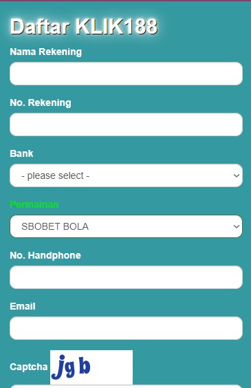 Daftar Judi Bola di KLIK188 sangatlah mudah. Anda cukup mengisi form pendaftaran KLIK188 dengan data-data yang lengkap dan valid. Cara Daftar judi bola ini adalah cara paling simple untuk dilakukan karena anda hanya perlu mengklik tombol pendaftaran KLIK188 dibawah ini. Setelah itu, Anda akan dihubungkan dengan sebuah form pendaftaran yang sudah tersedia seperti contoh dibawah ini.